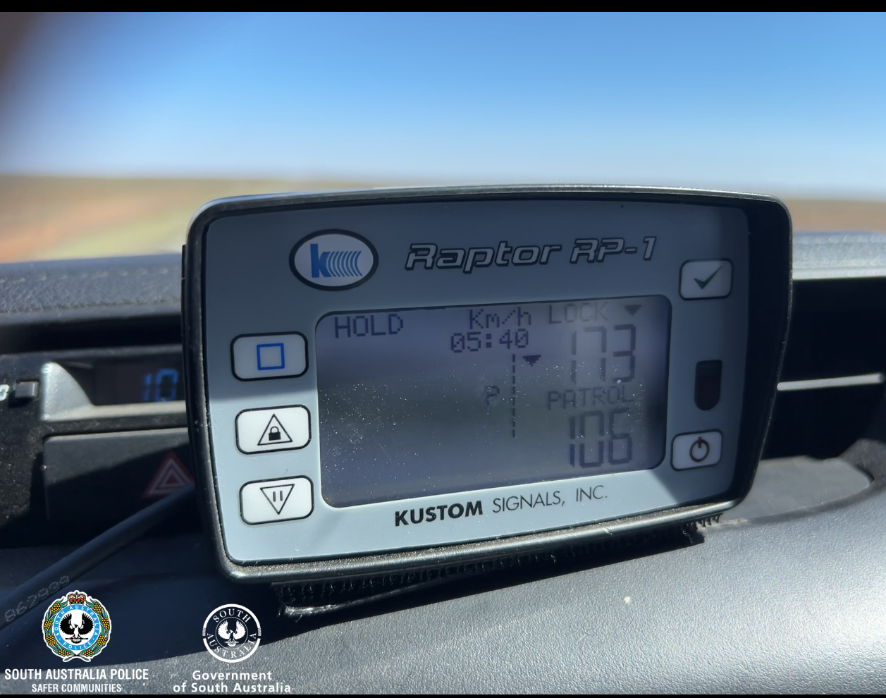 Just after 10.30am on Sunday 9 November, police detected a Jeep station wagon without registration plates travelling at 173 km/h in 110 km/h zone on the Stuart Highway at Ingomar.